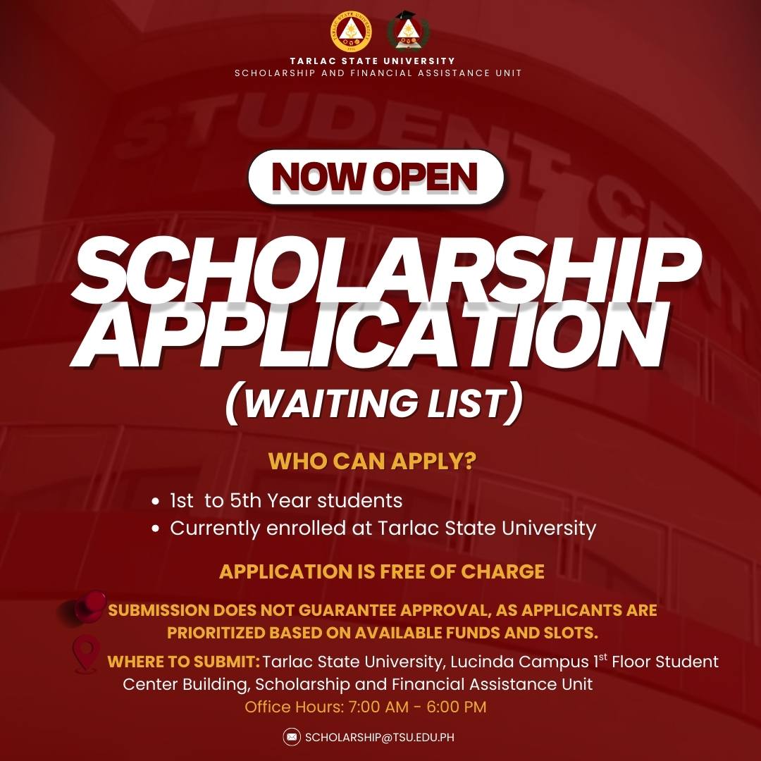 Calling the attention of all Tarlac State University students from 1st to 5th year. The application for the scholarship is now open and is free of charge.