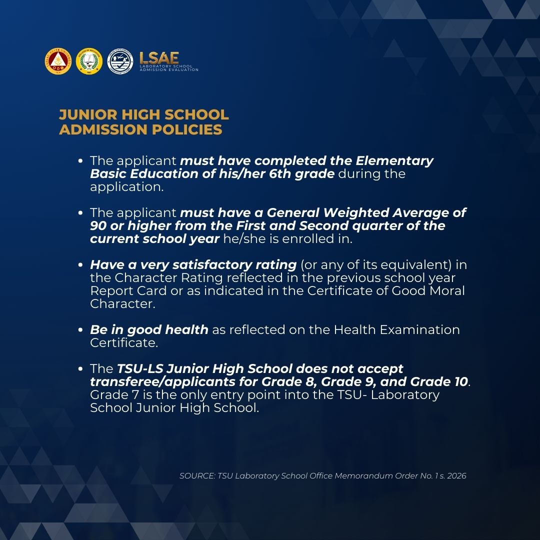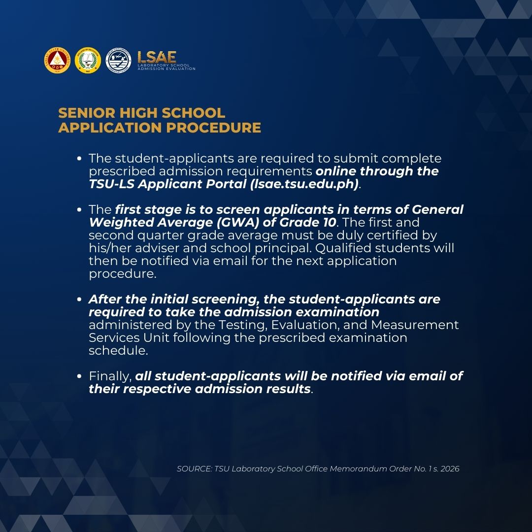 The online application for the Tarlac State University-Laboratory School Admission Evaluation (TSU-LSAE) will be open beginning February 1, 2026 (Sunday) until February 28, 2026 (Saturday).
